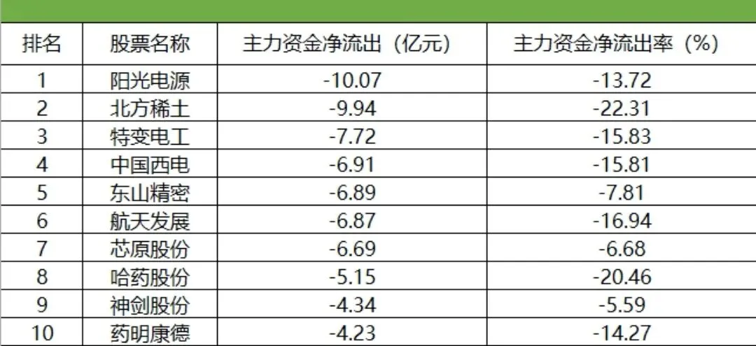 北方稀土、特变电工、中国西电等,主力资金净流出额居前,具体整理如下: