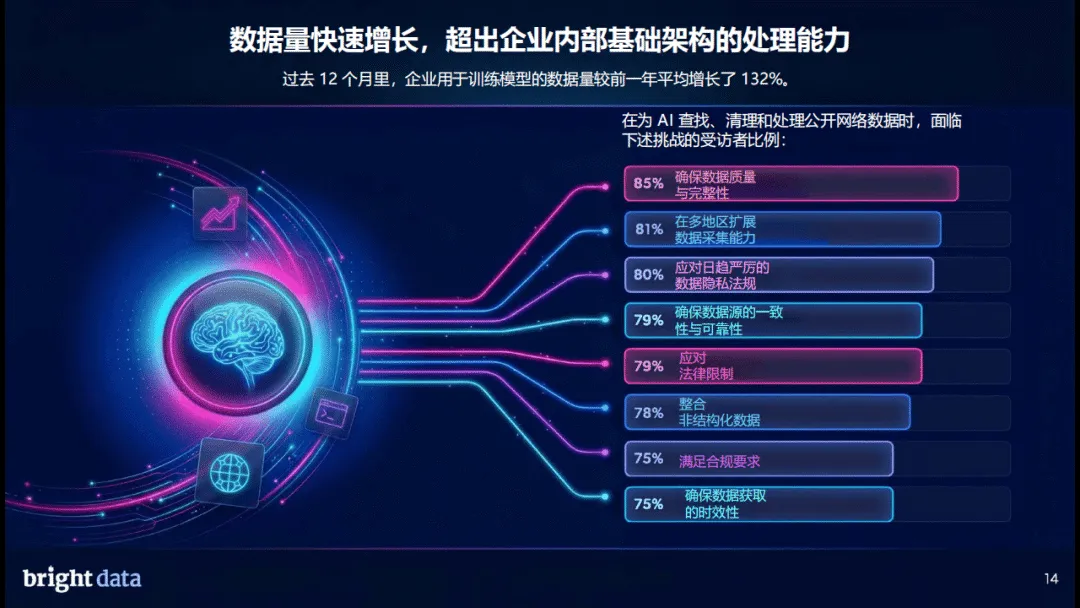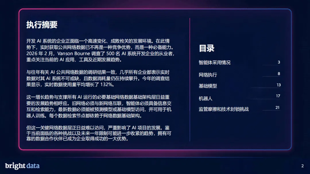 2026年,实时公共网络数据已成为AI系统开发的必备能力,企业AI相关数据消耗量持续攀升,过去12个月训练数据使用量平均增长132%,网络数据基础架构成为AI运行的核心支撑,其重要性愈发凸显。