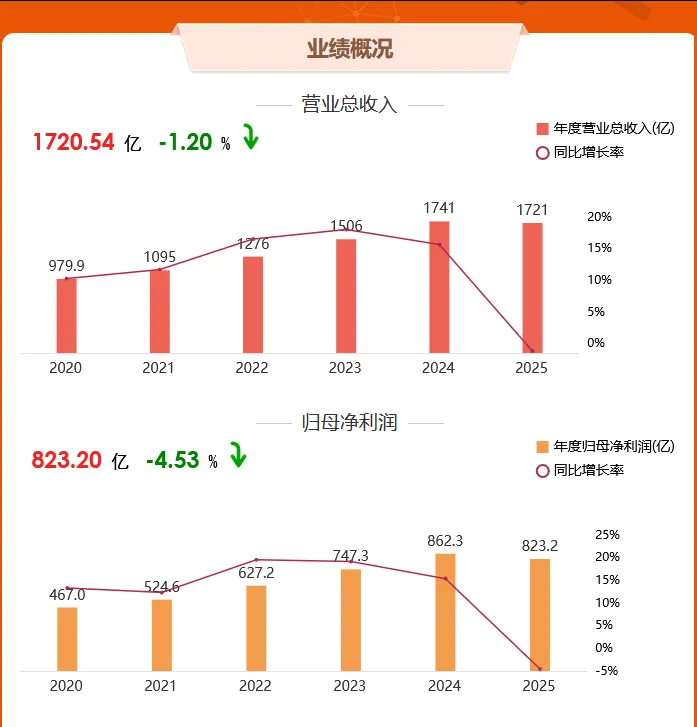 我们先来看看这两家公司交出的答卷,简直就是两个平行宇宙的缩影。中际旭创(AI的狂欢):2025年业绩预告显示,预计归母净利润高达45亿-57亿元,同比暴增111.64%-166.08%。核心驱动力只有一个——全球AI算力建设对800G/400G光模块的“饥渴”需求。它不需要讲故事,满手的订单就是最硬的底气。贵州茅台(白酒的去魅):2025年年报披露,营业总收入1720.54亿元(同比下降1.21%),归母净利润823.20亿元(同比下降4.53%)。这是其上市20多年来首次出现“双降”。市场情绪: “怕他订单太多做不完” “担心商务宴请永远回不来”拨开表象:这不是新旧交替,而是周期的错位