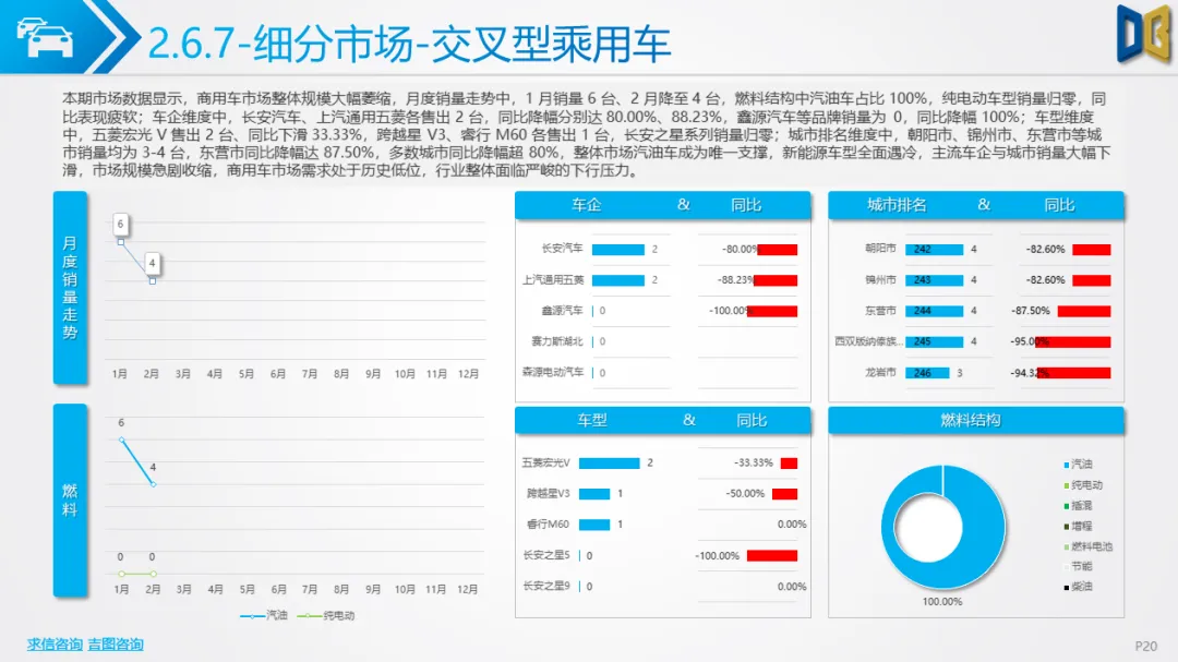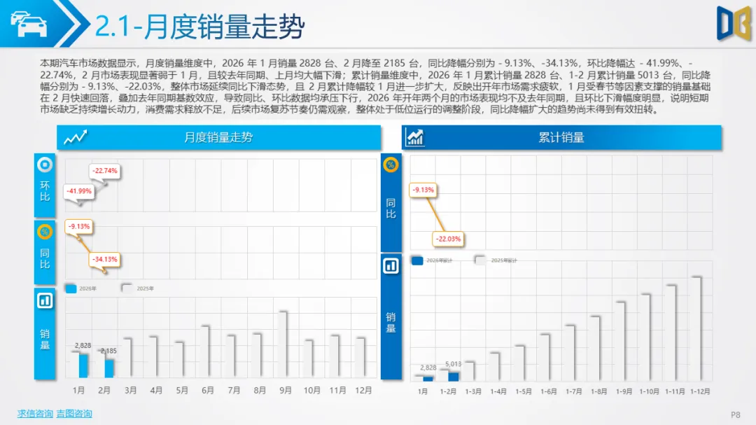 2026 年 1-2 月东营汽车市场整体深度调整、全面下滑,累计销量 5800 台,同比下降 25.05%,呈现国产主导、燃油为主、新能源承压、区域高度集中的特征。