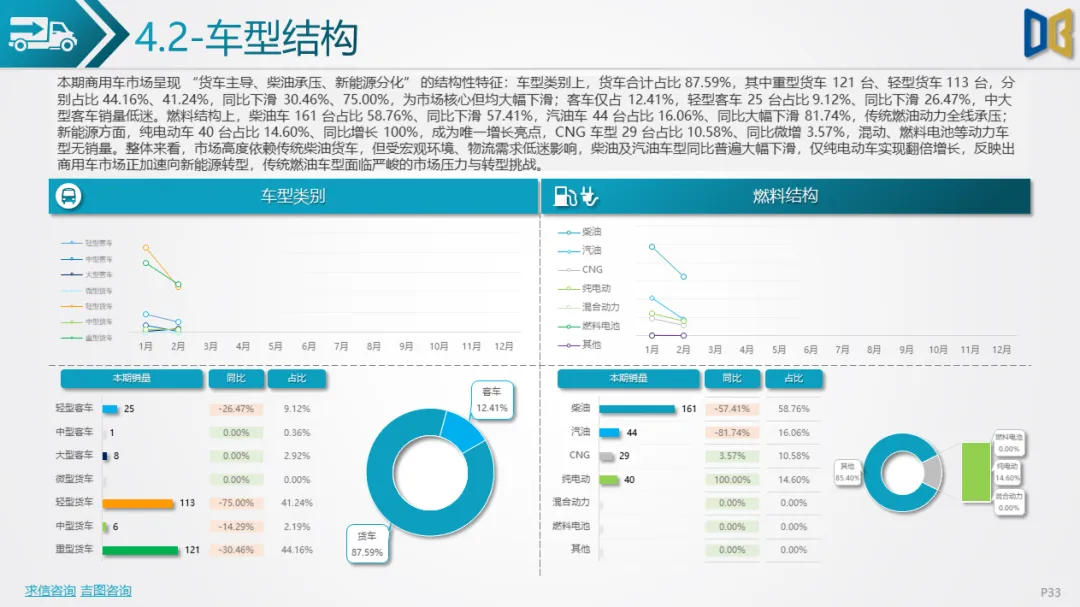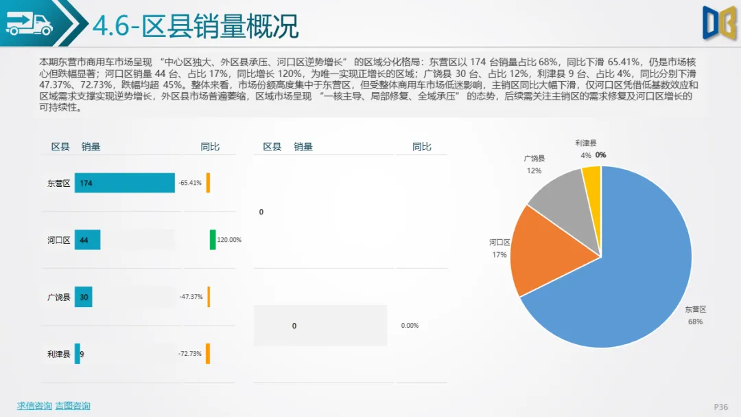 商用车市场同样低迷,累计销量 732 台,同比下滑 39.70%,以重卡、轻卡为主,传统柴油、汽油车型大幅下滑,纯电动翻倍增长成为唯一亮点。车企头部集中,福田、重汽领跑但普遍大跌,仅少数品牌低基数高增。区域上东营区占比 68%,仅河口区同比正增长。