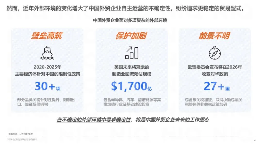 中国外贸在经历阶段性转型后已进入大出海时代,高附加值产品成为出海新动力。面对外部环境的不确定性,跨境电商以其稳定运营环境吸引外贸企业加码布局,成为中国品牌出海的重要增长引擎。