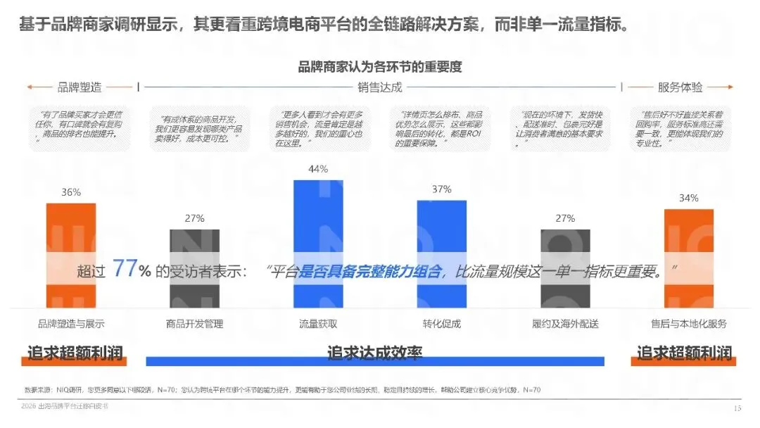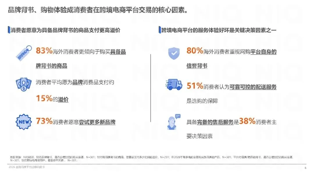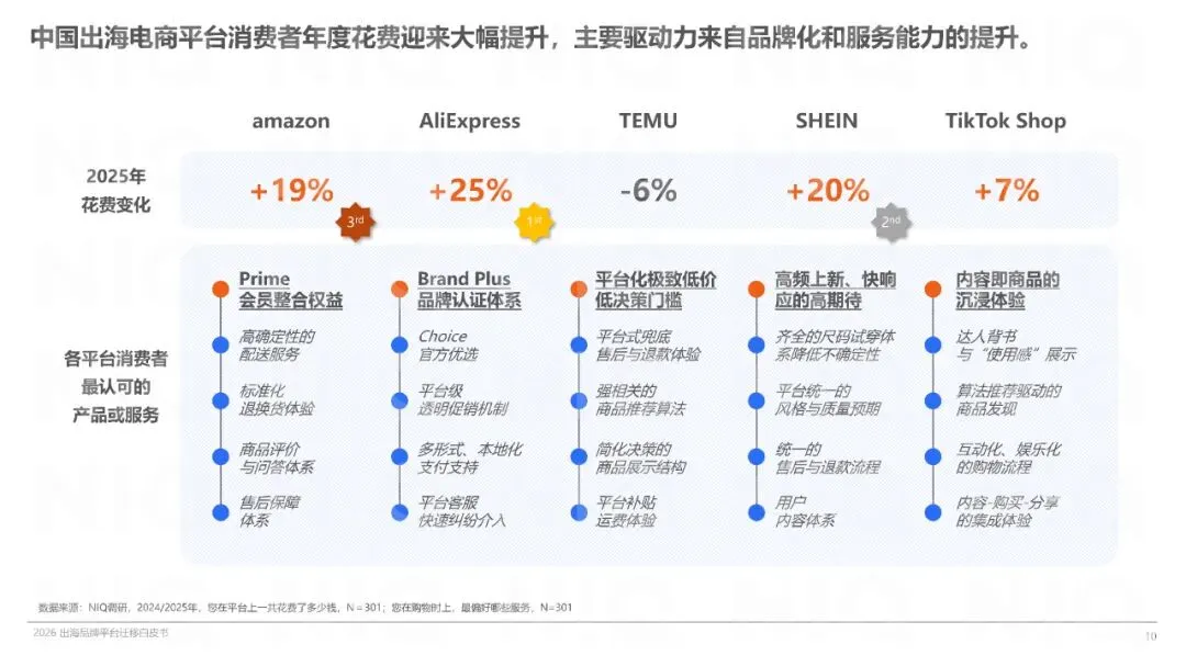 海外消费者对跨境电商的依赖度增强,花费意愿提升,且重视平台信誉、配送服务和售后服务。品牌背书与购物体验成为交易核心因素,消费者愿为品牌商品支付溢价。中国出海电商平台因性价比高、品类丰富、体验佳而受到青睐,多平台布局成主流趋势。