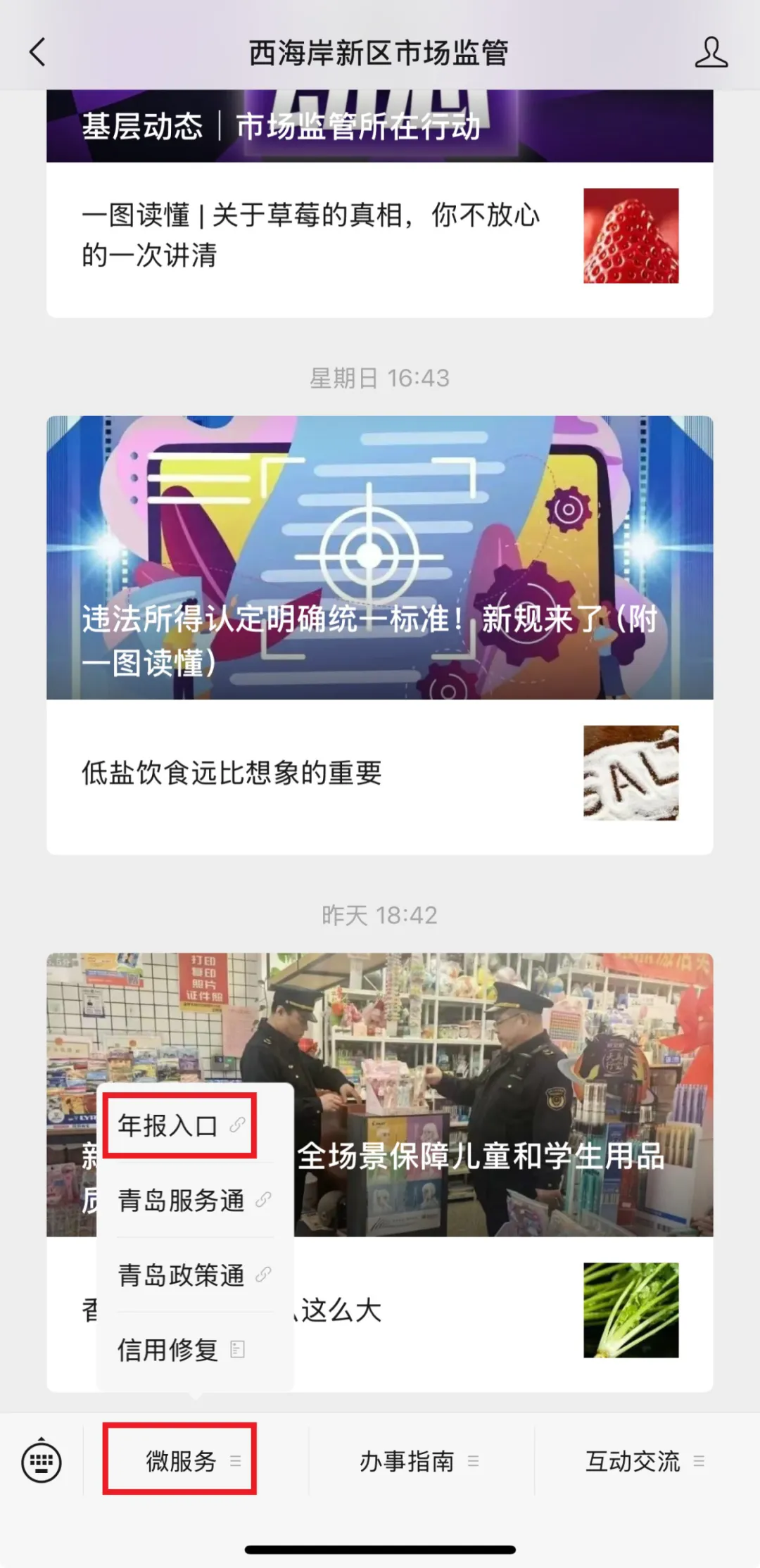 1.关注“西海岸新区市场监管”微信公众号,选择“微服务”→“年报入口”进入登录页。选择“市场联络员登录”(如未注册过联络员需要先注册)。