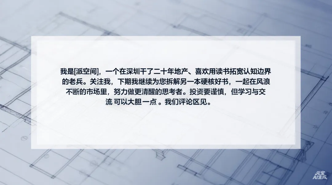 本公众号所有内容,包括本文,均为记录笔者个人在深圳地产行业二十年实践中的观察、思考与认知迭代。内容主体源于对各类金融、商业书籍的自我研读与知识解构,性质仅为个人学习笔记分享与知识交流。为提升内容的信息整合与编辑效率,本文在资料梳理与文本润色环节,约有5%的内容由人工智能(AI)工具辅助生成,并已进行人工深度核对、调整与责任背书。核心观点、逻辑框架及案例均为笔者原创。市场有风险,任何决策都需建立在您个人的独立研究判断之上。