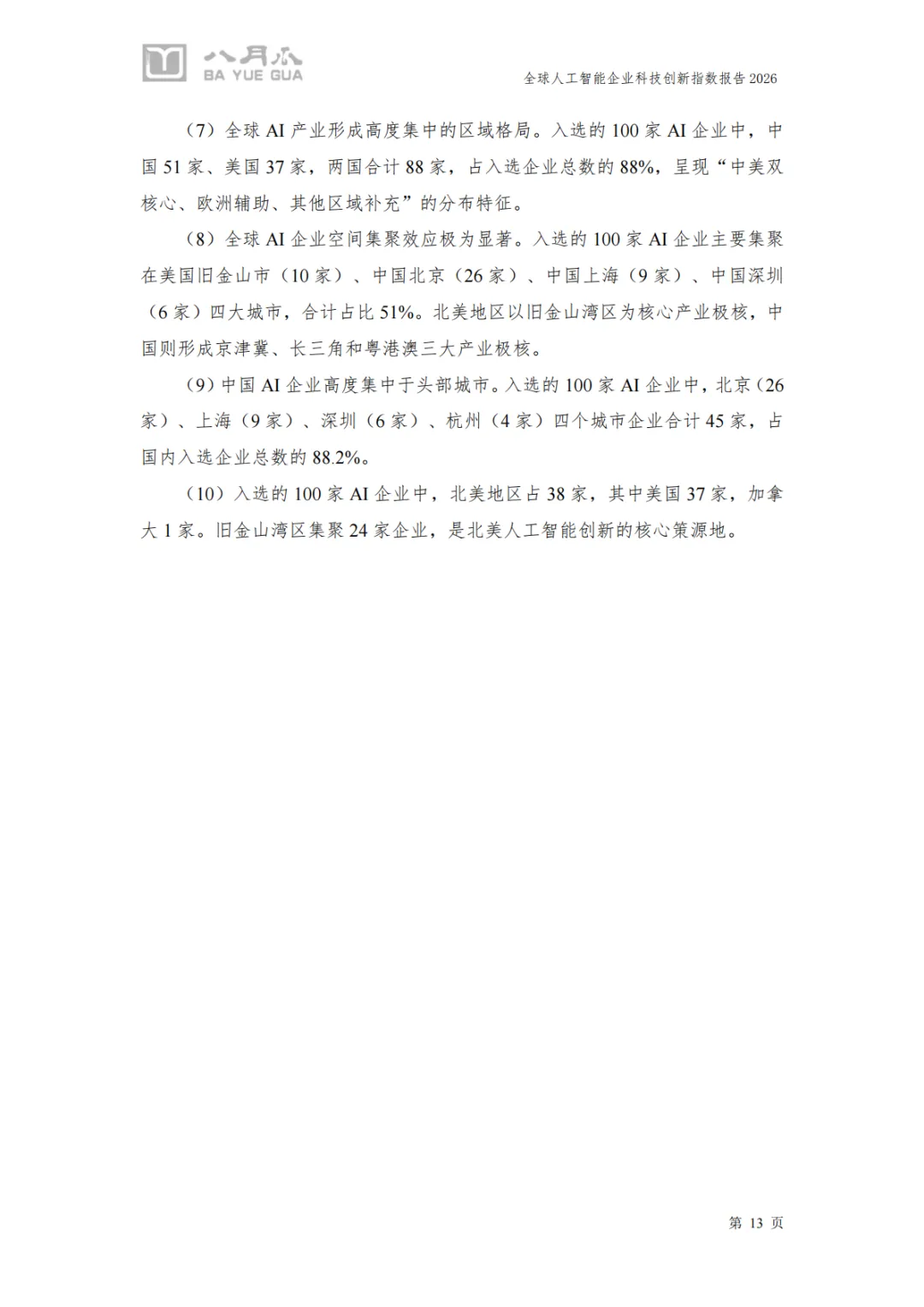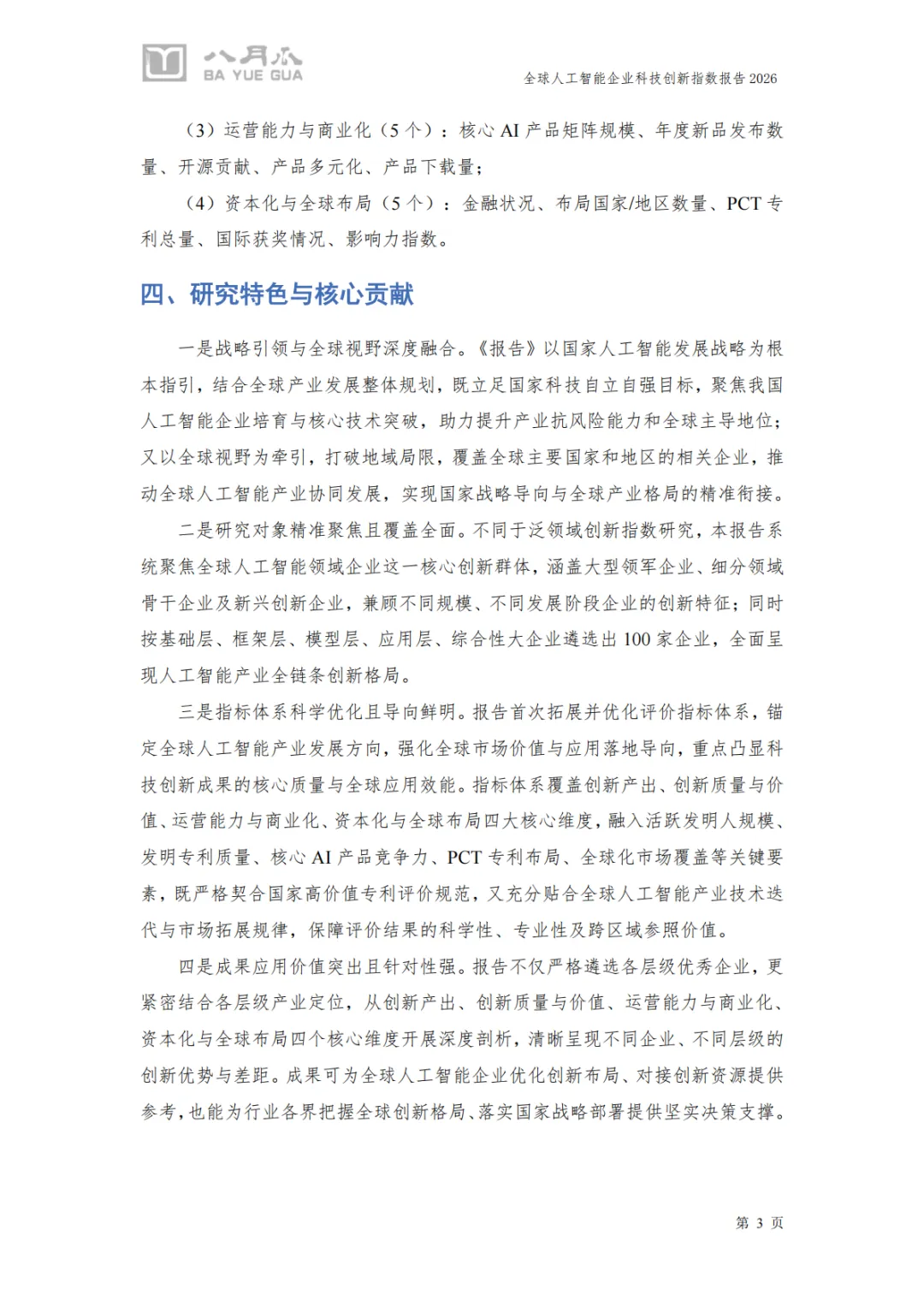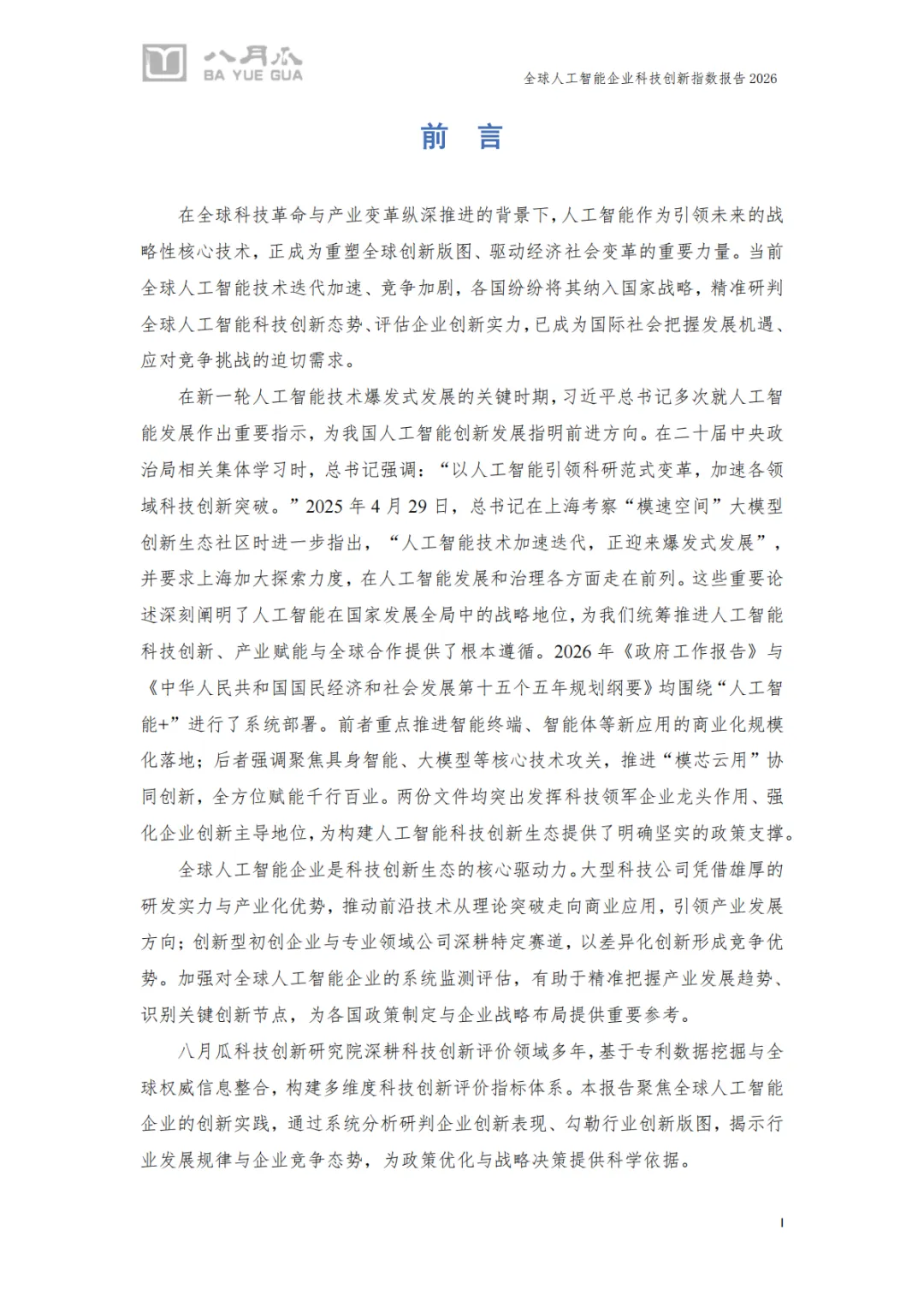 《2026年全球人工智能企业科技创新指数报告》由八月瓜科技创新研究院发布,系统性呈现了全球AI产业的创新格局与企业竞争力。以下是对报告核心内容的总结与分析: