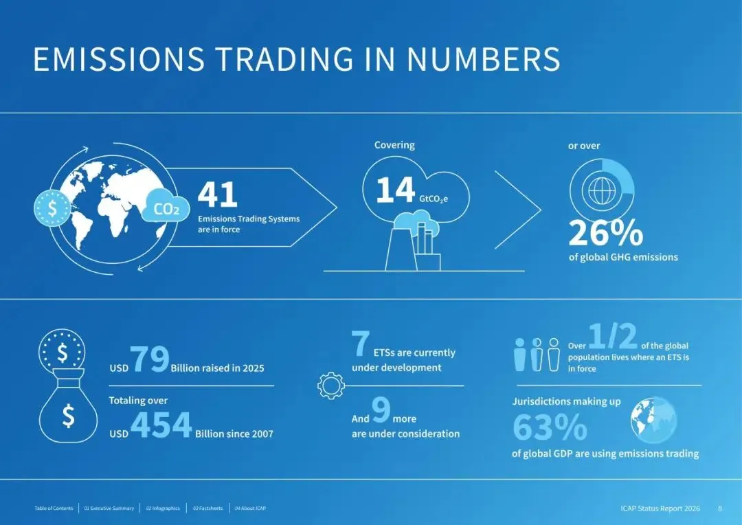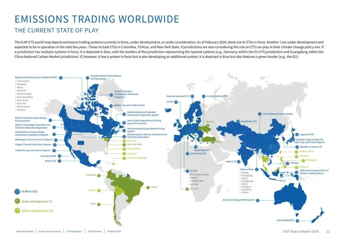 International Carbon Action Partnership(ICAP)近日正式发布《Emissions Trading Worldwide: Status Report 2026》(《全球碳市场进展报告2026》),总结了2025-2026年期间在全球气候治理与地缘政治环境交织演变的背景下,全球强制碳市场的运行现状。