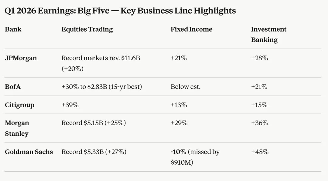 从上图可见,股票交易成为五大行Q1营收增长的核心引擎。“混乱是阶梯”——伊朗战争催生的大量交易需求,显然让投行赚得盆满钵满。然而,对于美股前景,高盛与大摩却给出了截然不同的判断。