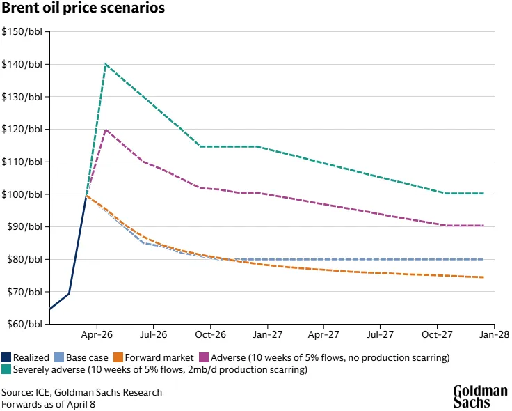 首当其冲的仍是国际油价。高盛预测,若停战协议未能维持且霍尔木兹海峡继续关闭一个月,油价可能在今年Q4仍维持在100美元/桶的高位。若海峡关闭超过一个月,且中东石油日产能损失维持在200万桶,油价将在Q4攀升至115美元/桶。届时,战争的影响将从交通、能源蔓延至工农业原材料乃至全行业,对全球经济造成深远冲击。