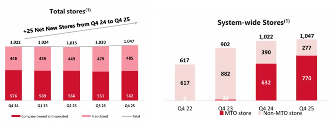 ,其中直营店减少14家,加盟店增加39家。通过关闭传统门店或升级改造,MTO店达到770家。