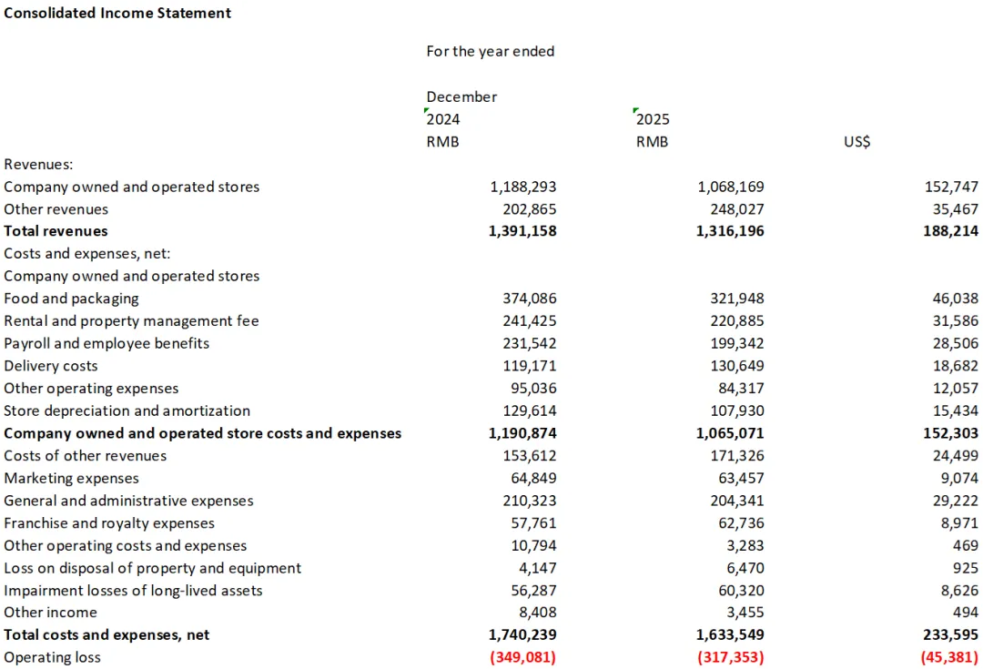 食品和包装、租金、人工、折旧,以及市场费用和其他行政开支等均有所下降,但配送费较大增长。2025年外卖订单占比89.3%,同比2024增长了3.2个百分点,