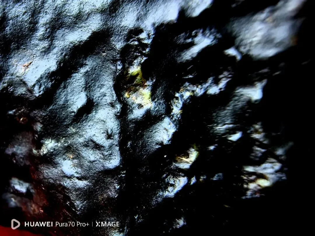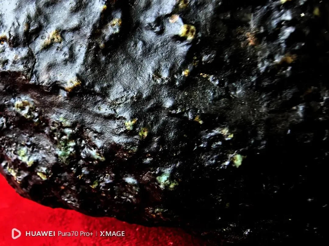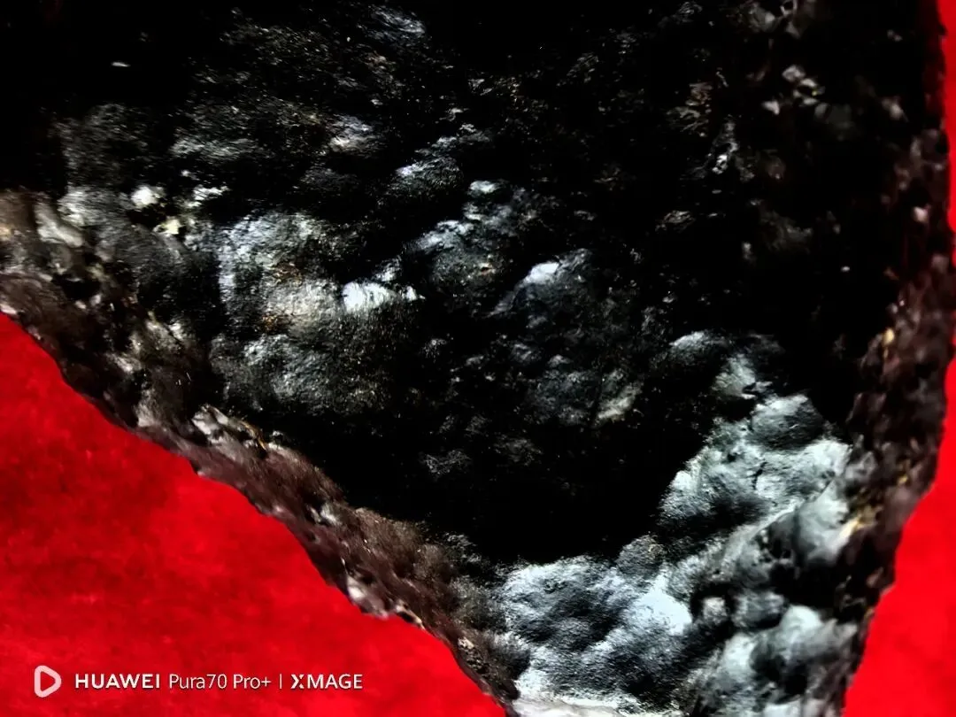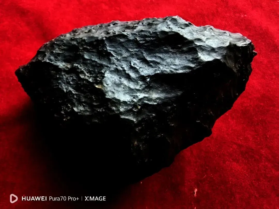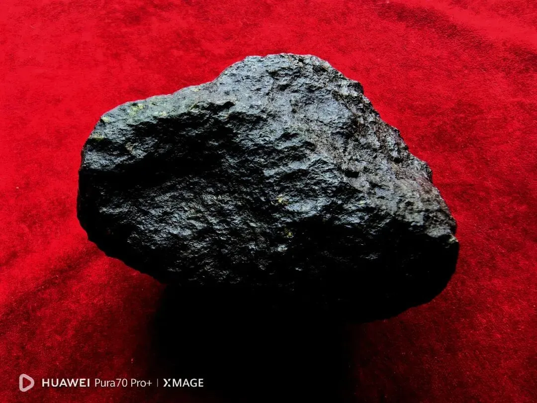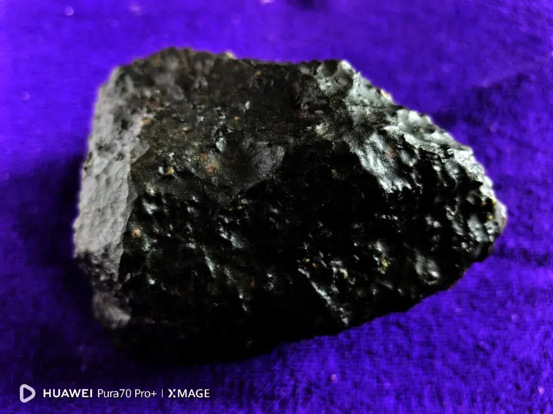 陨石色泽:整体呈纯黑色,表面因熔壳覆盖,色泽均匀,局部因轻微摩擦出现少量光泽差异;