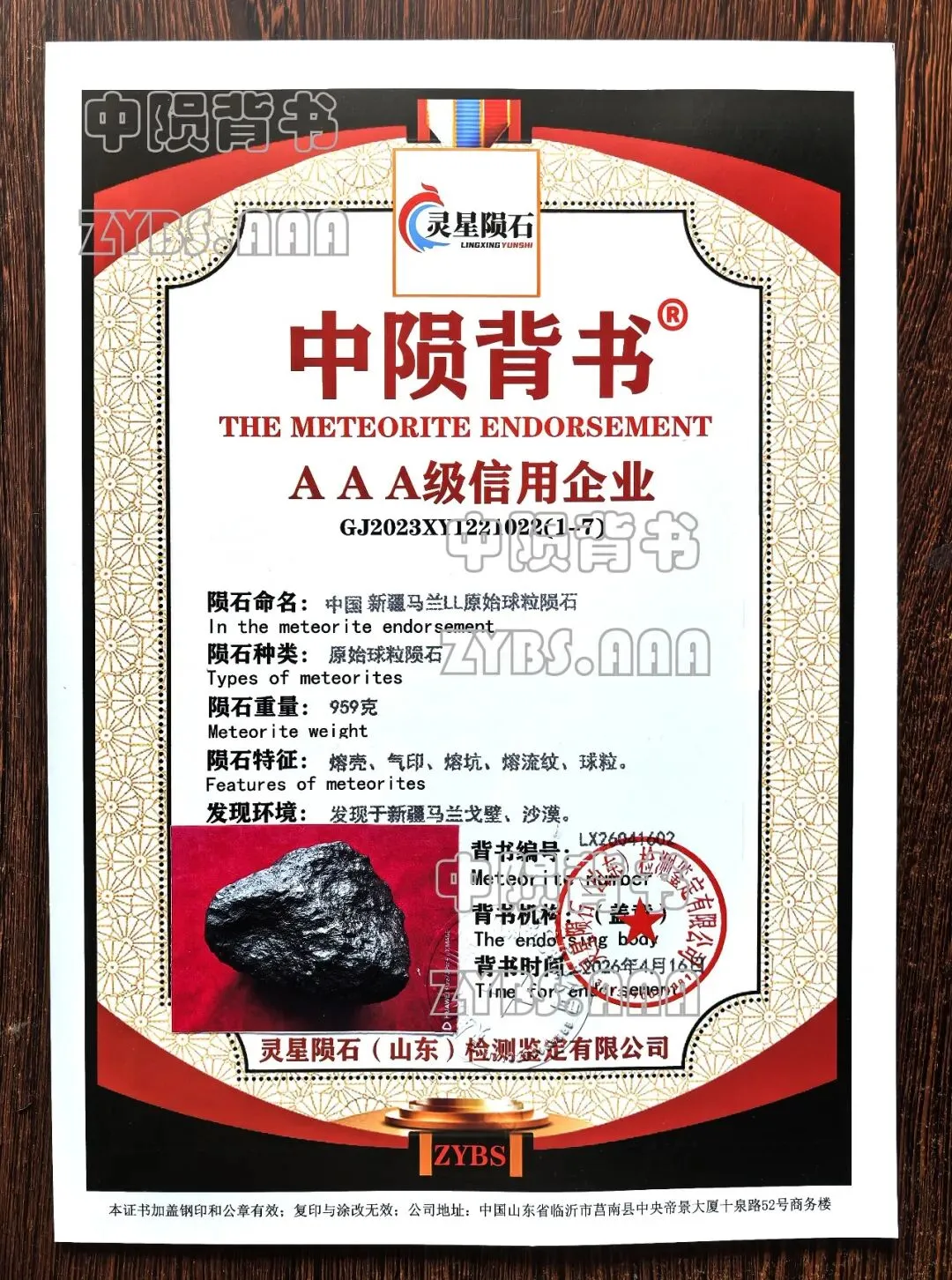 陨石重量:959克,属于中等重量陨石样本,便于后续各项检测与研究操作;