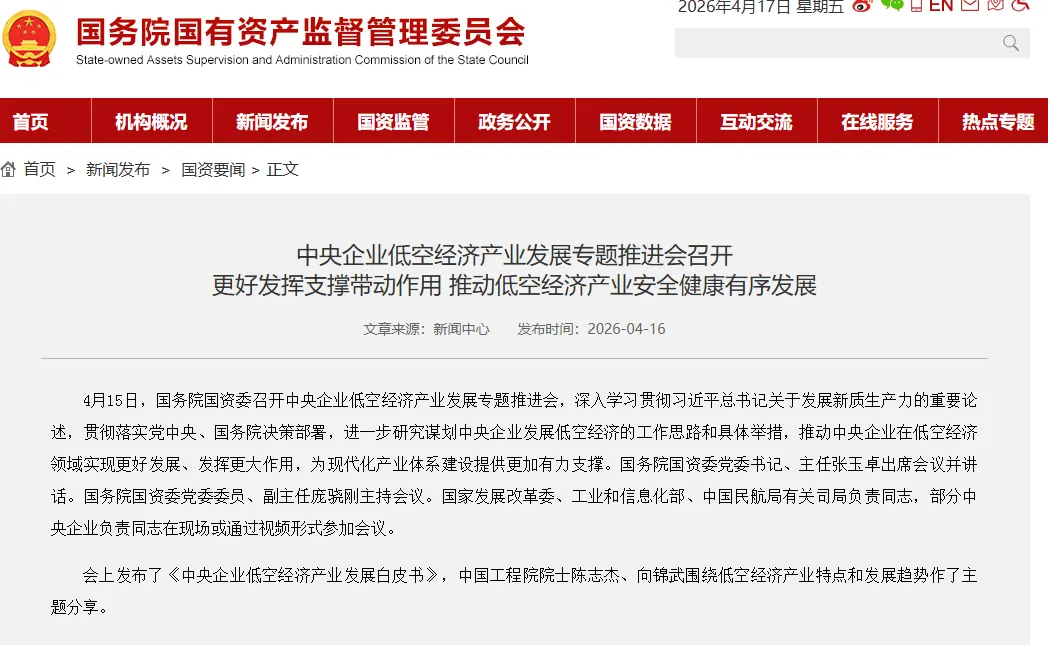 4月15日,国务院国资委召开中央企业低空经济产业发展专题推进会,深入学习贯彻习近平总书记关于发展新质生产力的重要论述,贯彻落实党中央、国务院决策部署,进一步研究谋划中央企业发展低空经济的工作思路和具体举措,推动中央企业在低空经济领域实现更好发展、发挥更大作用,为现代化产业体系建设提供更加有力支撑。