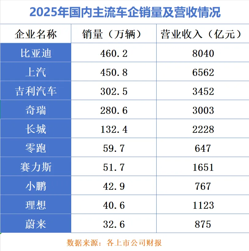 2025年国内各家车企财报正式公布,又到了车圈年度排名揭晓时刻!比亚迪以8040亿元营收稳居行业榜首,展现强大的经营实力!全年销量460.2万辆,不仅在国内领跑,同时比亚迪还成功跻身全球车企前五,超越通用、福特两大巨头,打破了长期由欧美日主导的车市格局,让中国品牌扬眉吐气!