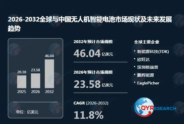 根据QYR(恒州博智)的统计及预测,2025年全球无人机智能电池市场销售额达到了20.38亿美元,预计2032年将达到46.04亿美元,年复合增长率(CAGR)为11.8%(2026-2032)。