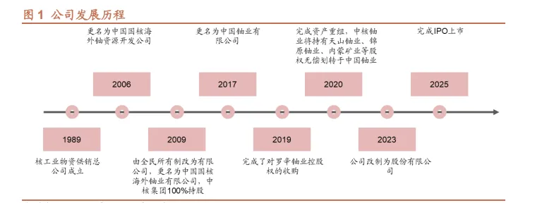 中国铀业前身为1989年设立的中国核工业物资供销总公司,2009年完成有限公司设立,2017年正式更名为中国铀业有限公司,2023年完成股改,于2025年正式登陆A股主板,成为国内首家上市铀矿企业。