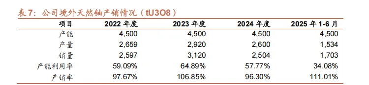 依据公告,2022-2024年公司海外天然铀产量在2600-2900吨上下,2025H1达到1534吨,不考虑2024年周期性检修因素的情况下,产能利用率持续提升。此外公司间接持股25%的LH铀业于2024年完成复产,2025年产量达到3MIb,四季度创复产后单季度最高产出。