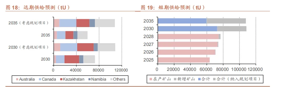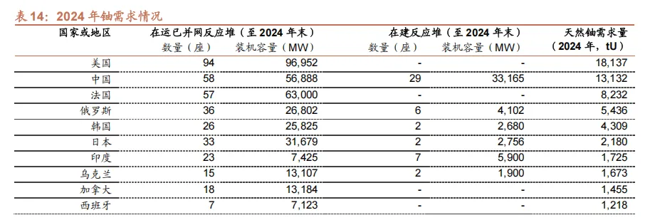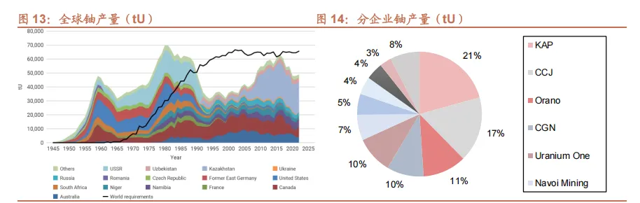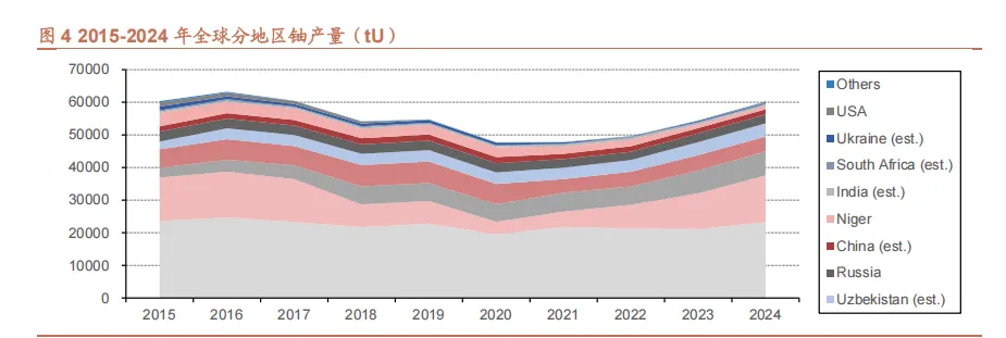 2024年全球铀产量约6万吨,哈萨克斯坦、加拿大、纳米比亚分别产2.33、1.43、0.73万吨,位居前三,分企业KAP、Cameco、Orano分别占21%、17%、11%,也相对集中。