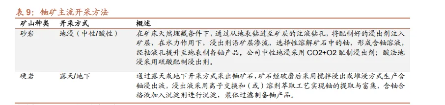 依据天然铀矿山资源类型不同,其生产方式主要涵盖露天/地下开采、地浸等方式。