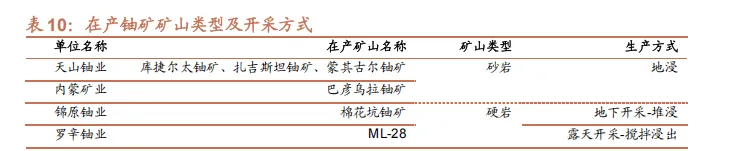 目前公司拥有探矿权6宗、采矿权19宗,当前在产铀矿山6座,包括天山铀业:库捷尔太铀矿、扎吉斯坦铀矿、蒙其古尔铀矿;锦原铀业:棉花坑铀矿;内蒙矿业:巴彦乌拉铀矿;罗辛铀业(海外):ML-28。天然铀生产规模行业领先,连续多年位列全球前十大天然铀生产商。