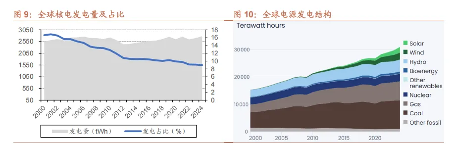 过去几年间,新能源贡献大部分全球电源增量,福岛事件后全球核电装机节奏放缓,装机增量有限,且部分电站停运。