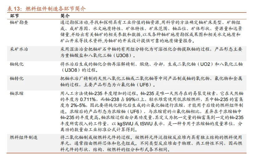 从天然铀矿到装入核反应堆发电之间需经过多重步骤处理,包括勘查、采冶、转化、浓缩、燃料制造及最终发电。