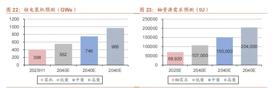 参考WNA口径,24年全球天然铀需求合计6.75万吨U,其中美、中、法分别为1.81、1.31、0.82万吨U,居全球前三,俄罗斯、韩国、日本等天然铀需求量亦处于较高水平。乐观/中性/悲观假设下,2040年全球核电装机966/746/552GW,对应铀资源需求20.4/15/10.7万吨,中性场景装机增幅87%,铀资源需求增幅118%。