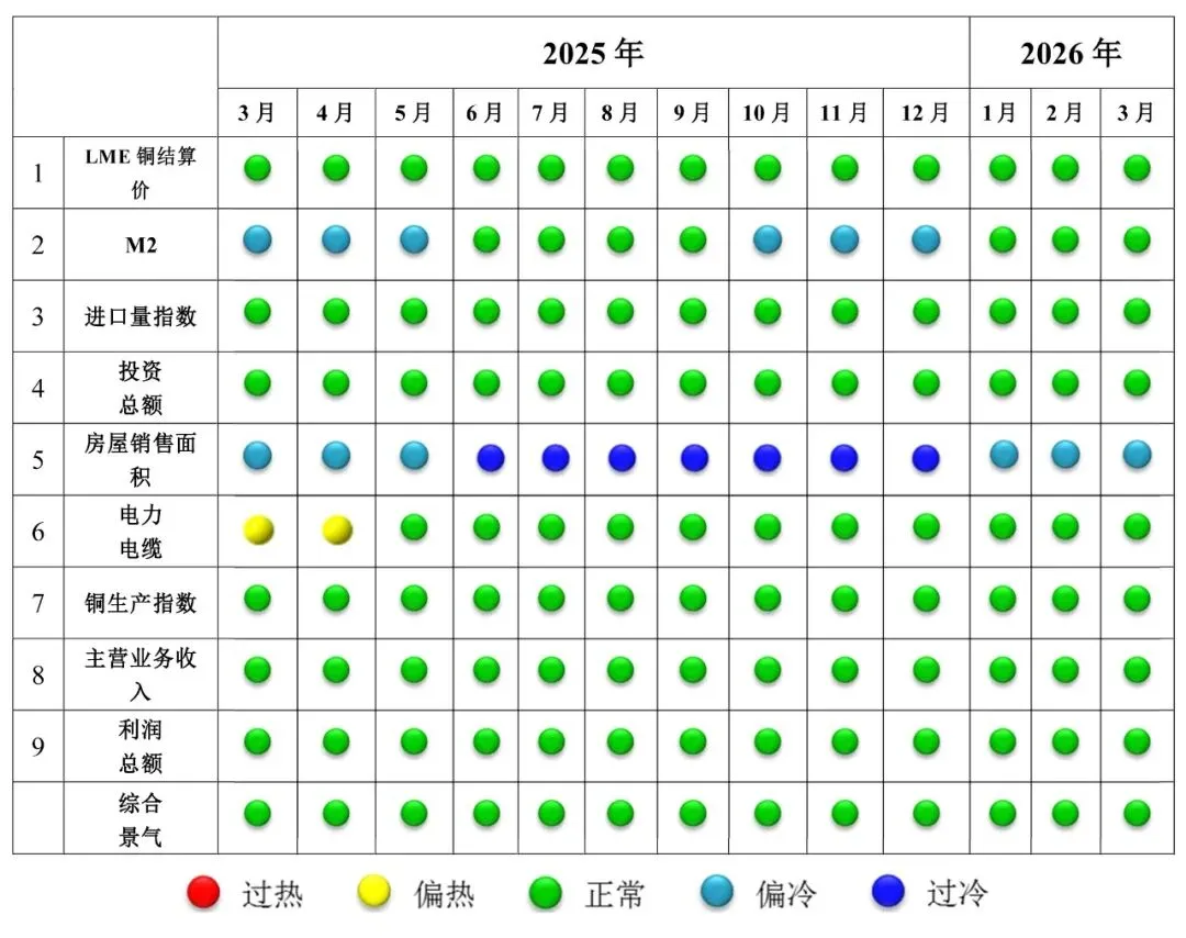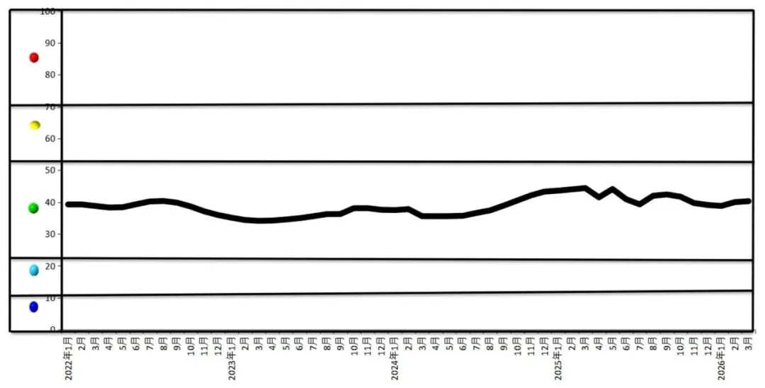 中国铜产业月度景气指数监测模型结果显示,2026年3月份,中国铜产业月度景气指数为40.3,较上月上升0.3个百分点,继续保持在“正常”区间运行;先行指数为79.5,较上月上升1.8个百分点;一致指数为75.1,较上月上升1.6个百分点。最近13个月中国铜产业月度景气指数见下表。