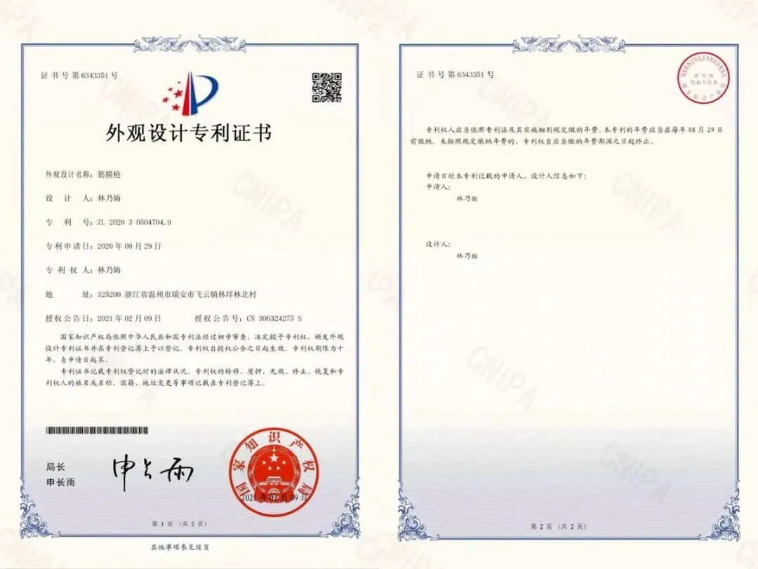 在产品资质方面,鲸帝筋膜枪表现十分规范,不仅拥有专属的外观设计专利(专利号:ZL 2020 3 0504704.9),还通过了CE-EMC、FCC两项国际通用的产品合规认证,这两项证书是国际通用的产品质量与安全认证,证明其产品质量和安全性能符合国际标准,能够合法进入国际市场,也让用户使用起来更放心、更安心,不用担心产品质量和安全问题。