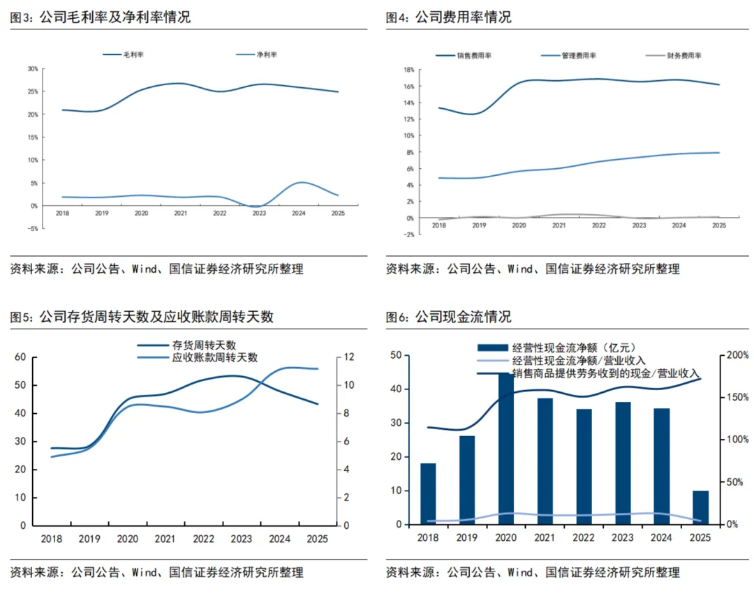 2025年公司整体毛利率/净利率分别为24.90%/-0.98pct,净利率下降主要系2024年发行REITs带来较多的非流动资产处置损益,导致比较基数较高。费用率方面,2025年公司销售/管理/财务费用率同比分别变动-0.59pct/+0.13pct/+0.08pct。经营活动现金流净额为9.93亿/yoy-71.00%,主要系子公司联华超市营业收入同比下降所致。