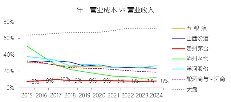营业成本为148.92亿元,同比增长8%,营业成本率升至8.82%,反映出生产成本刚性上涨与产品结构下沉的双重压力。尽管如此,公司十年平均营业成本率仅为8.44%,较行业均值低14.37个百分点,独特的产品稀缺性与品牌溢价构成深厚财务护城河。