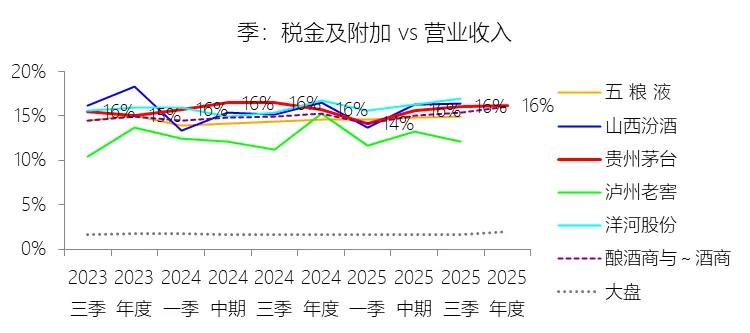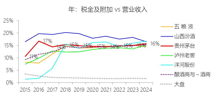 税金及附加:2025年,贵州茅台的税金及附加为273.54亿元,同比增长1.59%,与营业收入的比例为16.20%,同比上升0.45个百分点;2015-2024年(十年),此项合计为1392.32亿元,平均比例为14.93%,比酿酒商与葡萄酒商行业的均值高0.78个百分点,长期呈上升趋势。