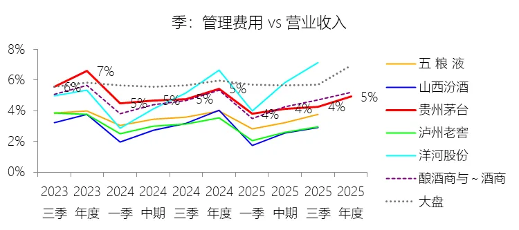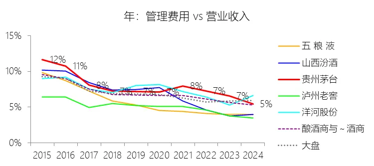 管理费用:2025年,贵州茅台的管理费用为83.20亿元,同比减少10.69%,与营业收入的比例为4.93%(管理费用率),同比下降0.52个百分点;2015-2024年(十年),此项合计为674.93亿元,平均比例为7.24%,比酿酒商与葡萄酒商行业的均值高0.69个百分点,长期呈下降趋势。