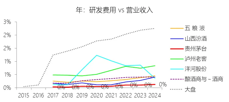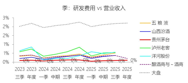 研发费用:2025年,贵州茅台的研发费用为1.90亿元,同比减少12.94%,与营业收入的比例为0.11%(研发费用率),同比下降0.02个百分点;2015-2024年(十年),此项合计为7.13亿元,平均比例为0.08%,比酿酒商与葡萄酒商行业的均值低0.23个百分点,长期呈上升趋势。