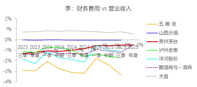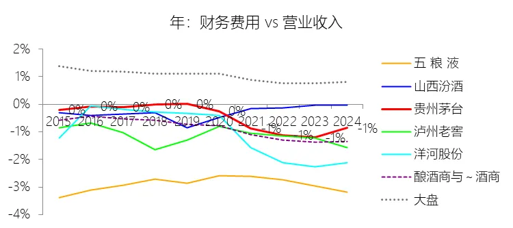财务费用:2025年,贵州茅台的财务费用为-8.15亿元,绝对值同比减少44.55%,与营业收入的比例为-0.48%,同比上升0.38个百分点;2015-2024年(十年),此项合计为-59.73亿元,平均比例为-0.64%,比酿酒商与葡萄酒商行业的均值高0.37个百分点,长期呈下降趋势。比例短期上升主要由于2025年商业银行存款利率下降,以及公司存款规模和结构的变化,导致利息收入显著缩减,在营业收入仅微降1.21%的背景下,财务费用绝对值的较大幅度变动直接推高了其占收入的比例。比例长期下降主要由于公司在过去十年间营业收入实现了超20%的年复合增长,积累了极其丰厚的现金储备,公司通过控股子公司贵州茅台集团财务有限公司对资金进行集中归集与高效运作,使得银行存款利息收入随资金规模的持续扩张而稳步攀升,推动了净利息收入(负的财务费用)占营收比重的长期扩大。比例高于酿酒商与葡萄酒商行业的均值主要由于公司拥有独特的财务公司架构,巨额现金储备交由茅台集团财务有限公司运作,相关收入被独立列入利息收入科目,不包含于财务费用;同时,由于贵州茅台的营业收入规模远超同类企业,作为分母的超大营收基数使得即便其利息收入绝对值极高,但在百分比占比上仍可能低于部分营收规模较小但资金运作较为激进的同行,从而在统计上呈现出高于行业均值的特征。