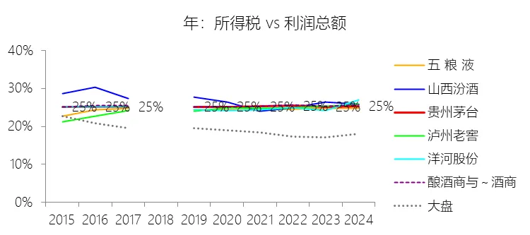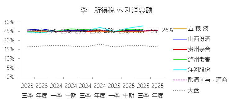 所得税率:2025年,贵州茅台的所得税为294.45亿元,同比减少2.83%,与利润总额的比例为25.66%(所得税率),同比上升0.33个百分点;2015-2024年(十年),此项合计为1633.70亿元,平均比例为27.45%,比酿酒商与葡萄酒商行业的均值低0.07个百分点,长期呈上升趋势。