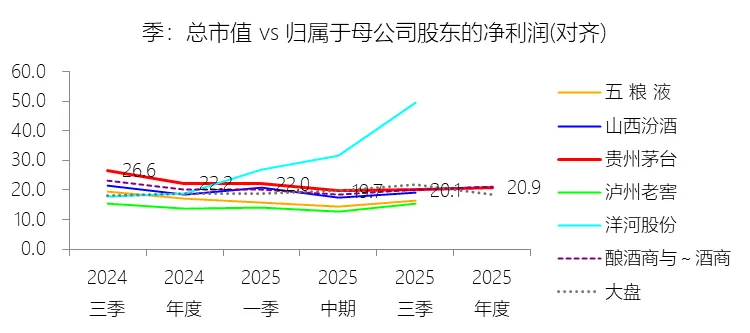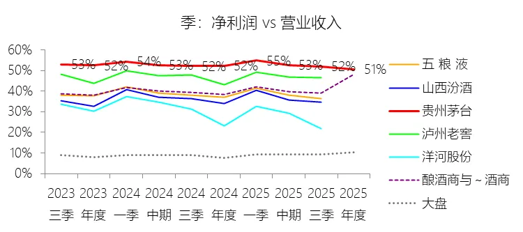 净利润方面,2025年实现净利润853.10亿元,同比减少4.5%;归属于母公司股东的净利润为823.20亿元,同比减少4.53%。净利率为50.53%,同比下降1.75个百分点,仍远超酿酒商与葡萄酒商行业均值约16个百分点,充分彰显头部品牌的盈利优势。