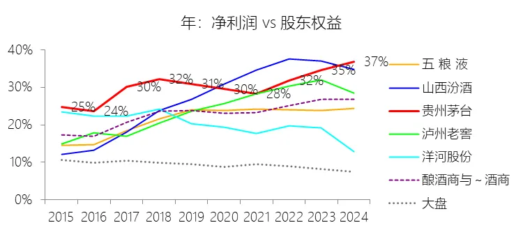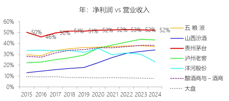 净利率:2025年,贵州茅台的净利润为853.10亿元,同比减少4.5%,与营业收入的比例为50.53%(净利率),同比下降1.75个百分点;2015-2024年(十年),此项合计为4826.68亿元,平均比例为51.75%,比酿酒商与葡萄酒商行业的均值高16.35个百分点,长期呈上升趋势。比例短期下降主要由于公司在2025年主动进行的酱香系列酒产品结构调整导致营业收入微降,而与此同时,受原材料及人工成本上涨影响,营业成本同比增长了8%,营业成本率同比上升0.75个百分点;此外,公司在2025年加大市场推广及服务投入,导致销售费用大幅增长28.62%,销售费用率同比上升1个百分点,加之系列酒毛利率因产品下沉调整同比下降3.76个百分点,以及税金及附加占比的上升,财务费用因存款减少、利息减少而负值增加,共同压缩了短期的净利润空间。比例长期上升主要由于公司在白酒行业由高速度增长迈向高质量发展的新阶段,成功实施了营销体制改革,持续提升毛利率极高的直销渠道占比,特别是“i 茅台”等数字营销平台的上线,使得直销毛利率长期维持在95%以上,显著高于传统批发代理渠道;同时,公司通过“双轮驱动”战略打造了千、百、十亿级大单品矩阵,在营业收入基数不断扩大的背景下,通过卓越的成本管理将平均营业成本率控制在8.44%的极低水平,推动了净利率的长期稳步增长。比例高于酿酒商与葡萄酒商行业的均值主要由于公司拥有独特的原产地环境、传承千年的生产工艺及著名的品牌影响力等核心竞争力,形成了极强的产品稀缺性和市场议价权;在财务效率上,公司十年平均营业成本率比行业均值低14.37个百分点,且凭借强大的品牌张力,其十年平均销售费用率仅为3.31%,比行业均值大幅低出7.93个百分点;这种极高的毛利水平与极低的费用率支撑了其净利率领先行业均值达16.35个百分点,充分彰显了全球烈性酒第一品牌的盈利张力。