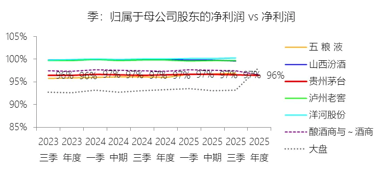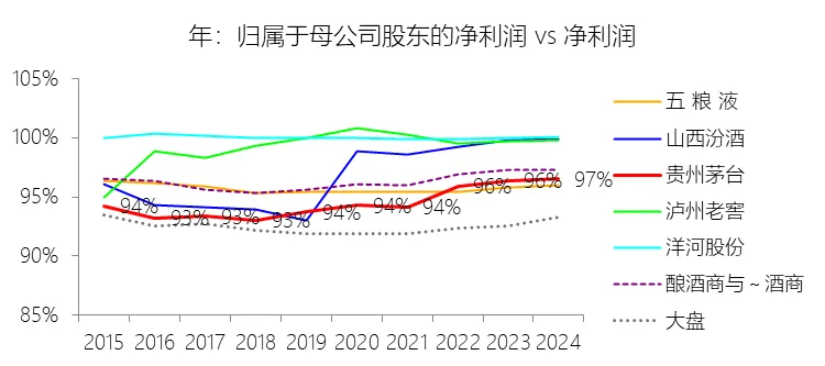 归属于母公司股东的净利润:2025年,贵州茅台的归属于母公司股东的净利润为823.20亿元,同比减少4.53%,与净利润的比例为96.49%,同比下降0.03个百分点;2015-2024年(十年),此项合计为4585.48亿元,平均比例为95.00%,比酿酒商与葡萄酒商行业的均值低1.5个百分点,长期呈上升趋势。