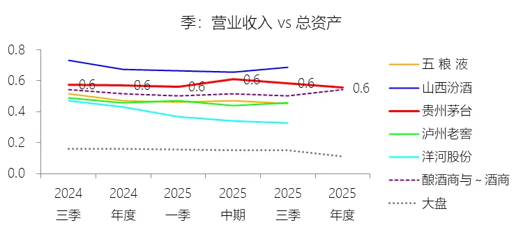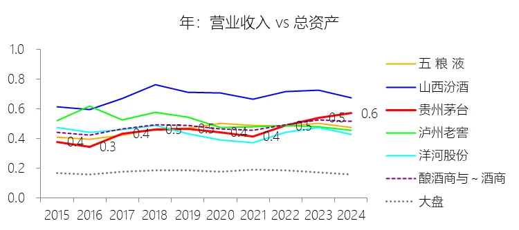 总资产周转率:2025年,贵州茅台的总资产周转率为0.6次,同比下降0.02次;2015-2024年(十年),平均总资产周转率为0.5次,比酿酒商与葡萄酒商行业的均值低0.01次,长期呈上升趋势。
