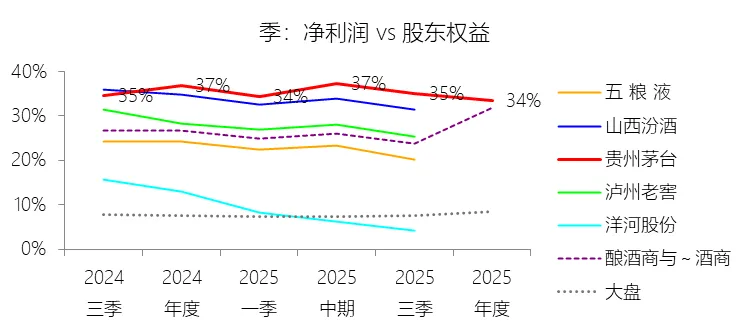 净资产收益率:2025年末,贵州茅台的股东权益为2539.59亿元,对比年初增长4.94%,净利润与股东权益的比例为33.59%(TTM净资产收益率),同比下降3.32个百分点;2015-2024年(十年),净利润与股东权益的平均比例为31.49%,比酿酒商与葡萄酒商行业的均值高7.68个百分点,长期呈上升趋势。