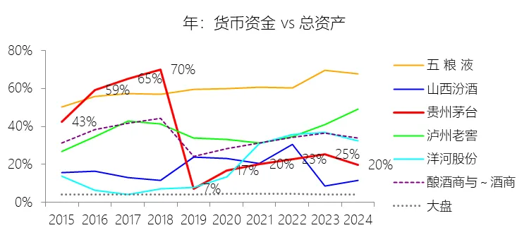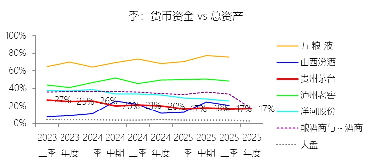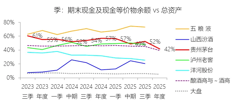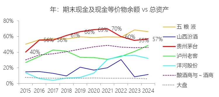 期末现金及现金等价物余额:2025年末,贵州茅台的期末现金及现金等价物余额为1264.26亿元,对比年初减少25.62%,与总资产的比例为41.61%,同比下降15.25个百分点;2015-2024年(十年),此项与总资产的平均比例为60.35%,比酿酒商与葡萄酒商行业的均值高16.36个百分点,长期呈上升趋势。