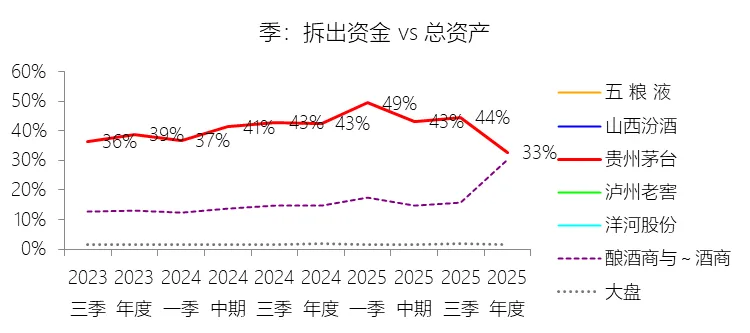 拆出资金:2025年末,贵州茅台的拆出资金为990.96亿元,对比年初减少22.09%,与总资产的比例为32.62%,同比下降9.93个百分点;2015-2024年(十年),此项与总资产的平均比例为36.52%,比酿酒商与葡萄酒商行业的均值高23.74个百分点,长期呈上升趋势。比例短期下降主要由于公司控股子公司贵州茅台集团财务有限公司在2025年收回了部分同业拆出资金,并根据市场利率环境与资金运作需求调整了资产配置结构,将更多资金转向同业存单等其他投资业务,导致拆出资金规模出现缩减。比例长期上升主要由于公司在过去十年间营业收入年复合增长达20.19%,凭借卓越的盈利能力积累了极其丰厚的现金储备,为提高资金收益率,公司通过茅台财务公司对集团内资金进行高效归集与运作,自2019年起大规模开展同业拆借业务,使得该科目占总资产的权重随业务规模扩张而大幅提升。比例高于酿酒商与葡萄酒商行业的均值主要由于公司拥有独特的集团财务公司架构及全球酒业领先的现金流获取能力,具备跨行资金拆借与运作的持牌职能;相比之下,五粮液、山西汾酒、泸州老窖等绝大多数行业同行并未开展此类大规模金融拆借业务,该科目在同行数据中长期表现为零或极低值,从而使得贵州茅台在资产结构的金融化运作上呈现出显著优于行业均值的特征。
