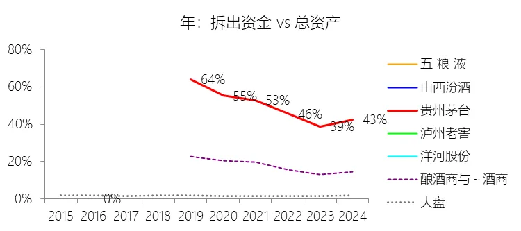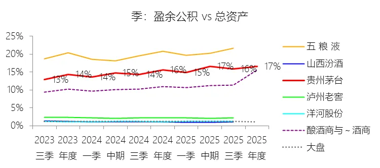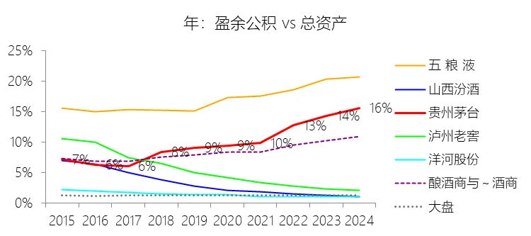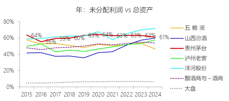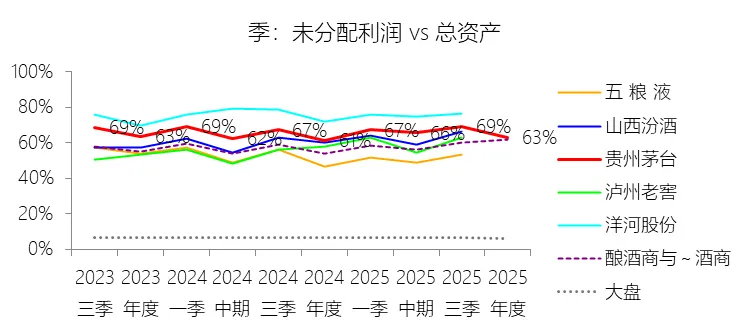 未分配利润:2025年末,贵州茅台的未分配利润为1919.05亿元,对比年初增长4.99%,与总资产的比例为63.16%,同比上升2.02个百分点;2015-2024年(十年),此项与总资产的平均比例为62.13%,比酿酒商与葡萄酒商行业的均值高10.45个百分点,长期呈上升趋势。