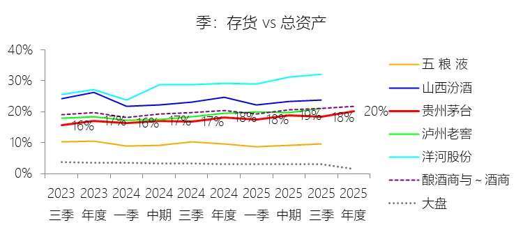 存货:2025年末,贵州茅台的存货为614.27亿元,对比年初增长13.04%,与总资产的比例为20.22%,同比上升2.04个百分点;2015-2024年(十年),此项与总资产的平均比例为15.79%,比酿酒商与葡萄酒商行业的均值低4.35个百分点,长期呈下降趋势。