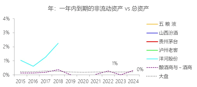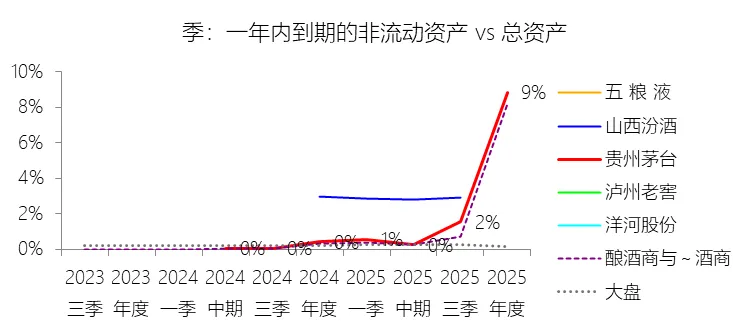 一年内到期的非流动资产:2025年末,贵州茅台的一年内到期的非流动资产为268.71亿元,对比年初增长2118.99%,与总资产的比例为8.84%,同比上升8.44个百分点;2015-2024年(十年),此项与总资产的平均比例为0.17%,比酿酒商与葡萄酒商行业的均值高0.02个百分点,长期呈下降趋势。比例短期上升主要由于公司控股子公司贵州茅台集团财务有限公司持有的部分债权投资将于一年内到期,由此进行的会计重分类导致该项资产账面价值同比大幅增长;根据2025年财报明细,公司在年末持有的大量同业存单(如农业银行、民生银行、中信银行、中国银行等发行的CD)合计约194亿元将于2026年1月陆续到期,使得该科目规模由年初的12.11亿元激增至268.71亿元。比例长期下降主要由于公司总资产在过去十年间实现了跨越式扩张,年复合增长率达14.8%,资产基数已由2015年的863.01亿元增长至2024年末的2989.45亿元,而一年内到期的非流动资产主要受大额金融工具到期节奏的影响,在多数年份(如2015-2018年及2022年)的账面价值为零或极低,这种非持续性变动的项目在持续增长的资产总量背景下,其权重随资产基数扩大而自然稀释,从而在长期统计中呈现下降趋势。比例高于酿酒商与葡萄酒商行业的均值主要由于公司拥有独特的集团财务公司架构及极其丰厚的现金储备,其通过财务公司开展的大规模债权投资、同业存单及大额存单业务规模远超行业同行,导致在金融工具重分类至该科目时,其所体现的资产规模和占比均略高于缺乏此类金融运作规模的酒类企业均值。
