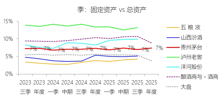 固定资产:2025年末,贵州茅台的固定资产为224.88亿元,对比年初增长2.82%,与总资产的比例为7.40%,同比上升0.09个百分点;2015-2024年(十年),此项与总资产的平均比例为8.46%,比酿酒商与葡萄酒商行业的均值低2.84个百分点,长期呈下降趋势。