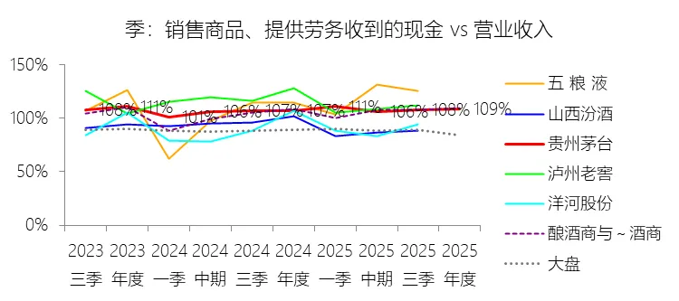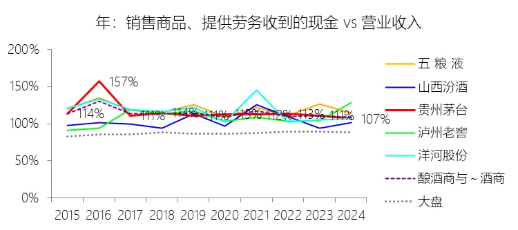 销售商品、提供劳务收到的现金:2025年,贵州茅台的销售商品、提供劳务收到的现金为1839.90亿元,同比增长0.74%,与营业收入的比例为108.97%,同比上升2.1个百分点;2015-2024年(十年),此项合计为10551.48亿元,平均比例为113.14%,比酿酒商与葡萄酒商行业的均值高0.26个百分点,长期呈下降趋势。