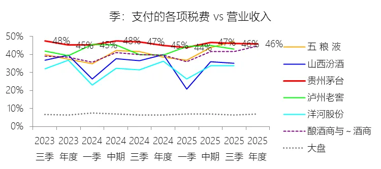 支付的各项税费:2025年,贵州茅台的支付的各项税费为774.31亿元,同比增长0.49%,与营业收入的比例为45.86%,同比上升0.77个百分点;2015-2024年(十年),此项合计为4184.68亿元,平均比例为44.87%,比酿酒商与葡萄酒商行业的均值高8.04个百分点,长期呈上升趋势。